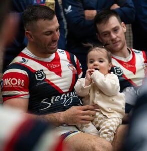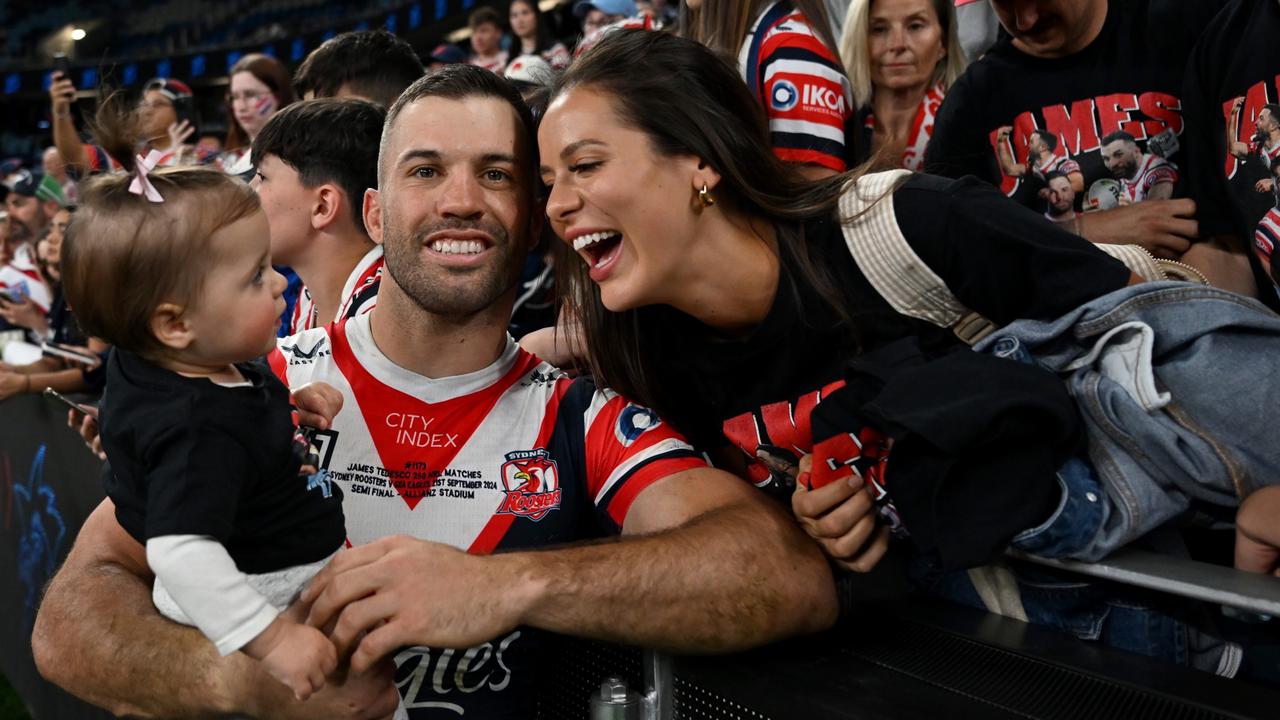 SYDNEY, AUSTRALIA – APRIL 25: James Tedesco of the Roosters poses with his wife Maria Glinellis and daughter Rosie Mae after winning the round eight NRL match between the Sydney Roosters and St George Illawarra Dragons at Allianz Stadium on April 25, 2025, in Sydney, Australia. (Photo by Cameron Spencer/Getty Images)