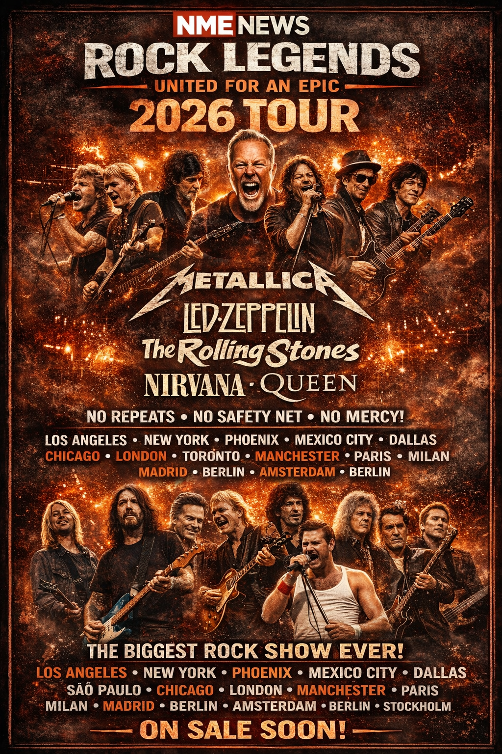 The announcement dropped like a meteor strike late last night, exploding across social platforms and music news feeds worldwide. A blazing, fire‑soaked poster teased the lineup with all the swagger and intensity you’d expect from rock’s immortals — a visual promise of sonic devastation and emotional payoff. The headline: “Rock Legends Unite — 2026 Tour.”
